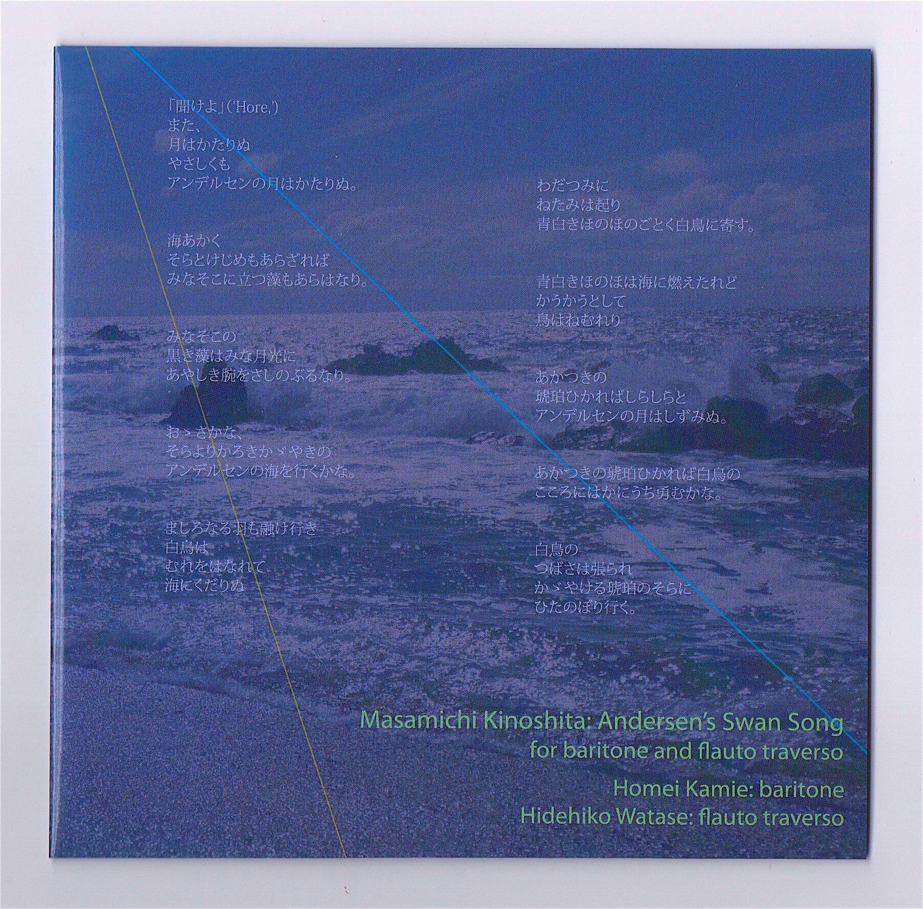 2011年、木下正道は、渡瀬英彦のフルート・ソロ・リサイタルの委嘱作品として、「アンデルセン白鳥の歌」(バリトンとフラウト・トラヴェルソのための) を作曲 (歌詞は、宮沢賢治の連作短歌「アンデルセン白鳥の歌」に拠る)。本アルバムには、翌年2012年12月東京の教会における、渡瀬英彦 (フラウト・トラヴェルソ [フルートの前身楽器]) と上江法明 (バリトン) のふたりによる41分の演奏を収録している。なお、上江法明は2015年に他界。このCDは彼の思い出に捧げられた。(レーべルの版元ショップFtarriの解説より転載)